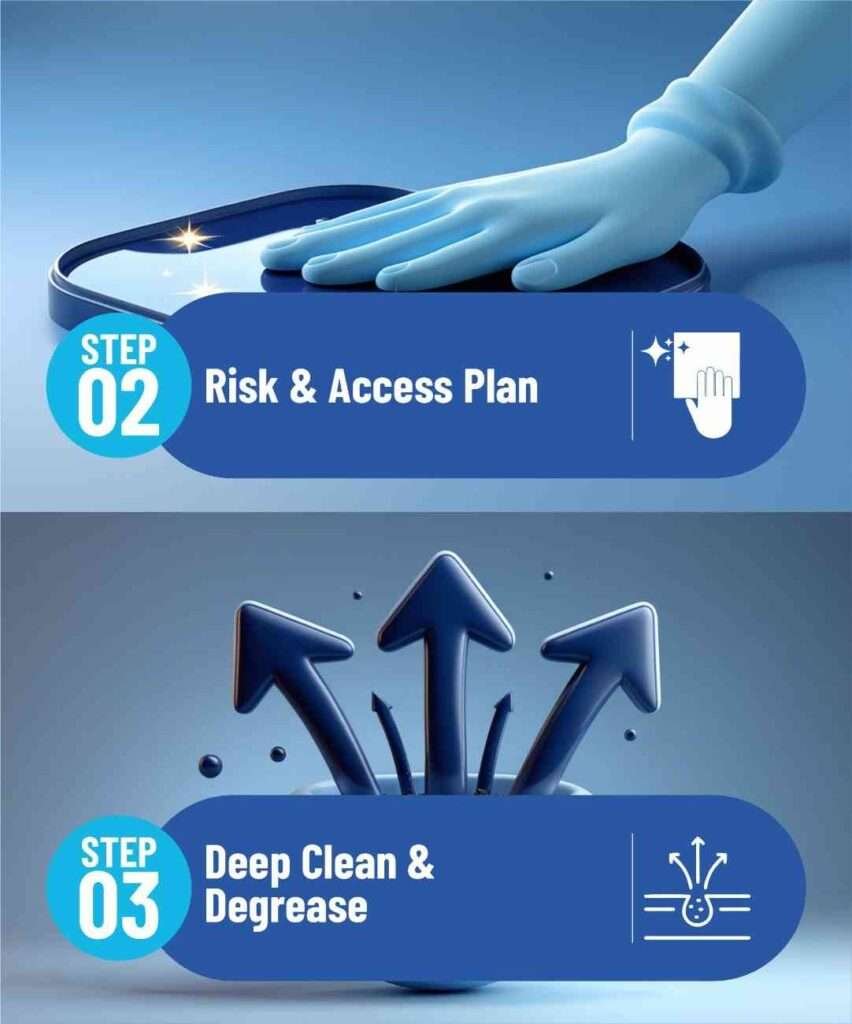 We make professional kitchen cleaning simple, transparent, and reliable. Here’s how our four-step process works: