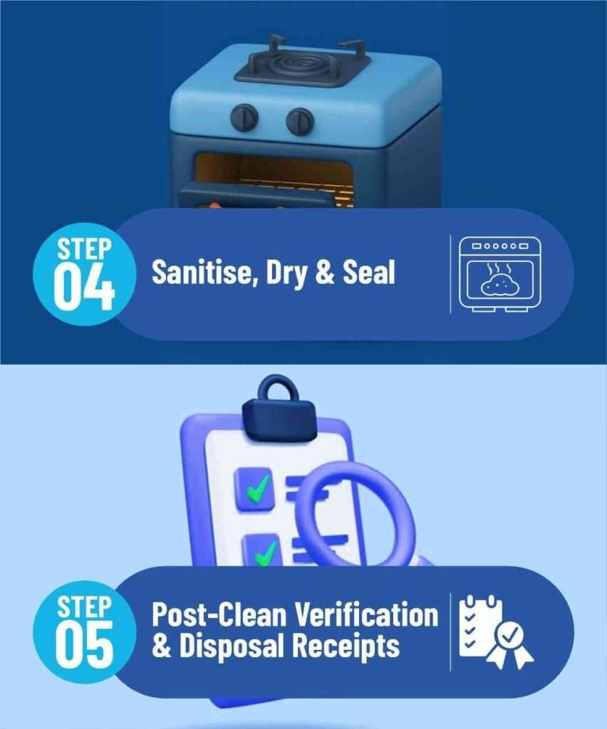 Efficient, thorough, and compliant kitchen cleaning tailored for your needs. Our five-step cleaning process ensures your kitchen is hygienic, safe, and ready for business operations with minimal disruption.